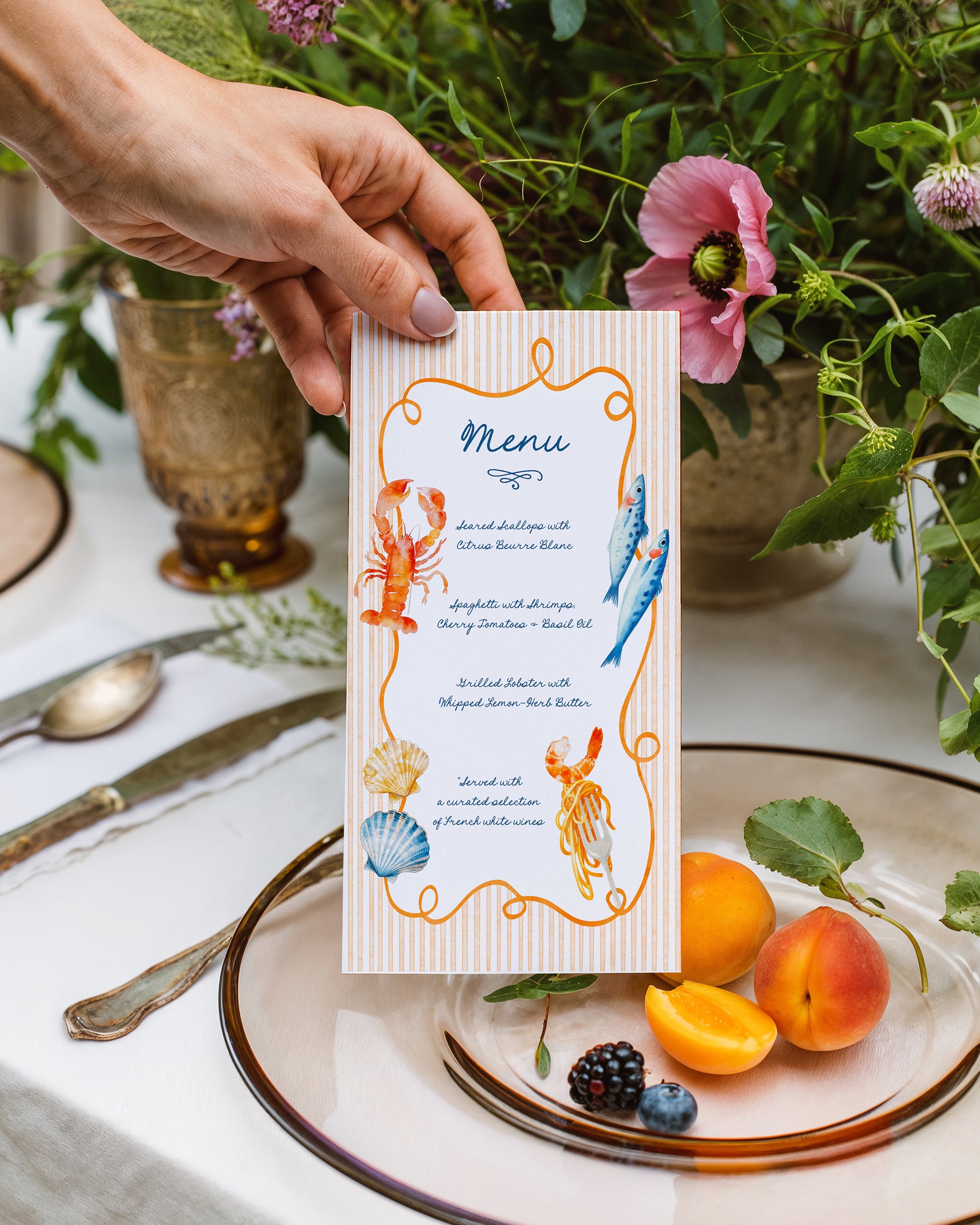 Inspiré par l'élégance insouciante de l'ensoleillée Amalfi, ce menu dessiné à la main rassemble des illustrations fantaisistes, des bordures ondulées et une touche rétro fraîche, parfait pour les couples à la recherche de quelque chose d'amusant, d'élégant et d'unique en son genre.