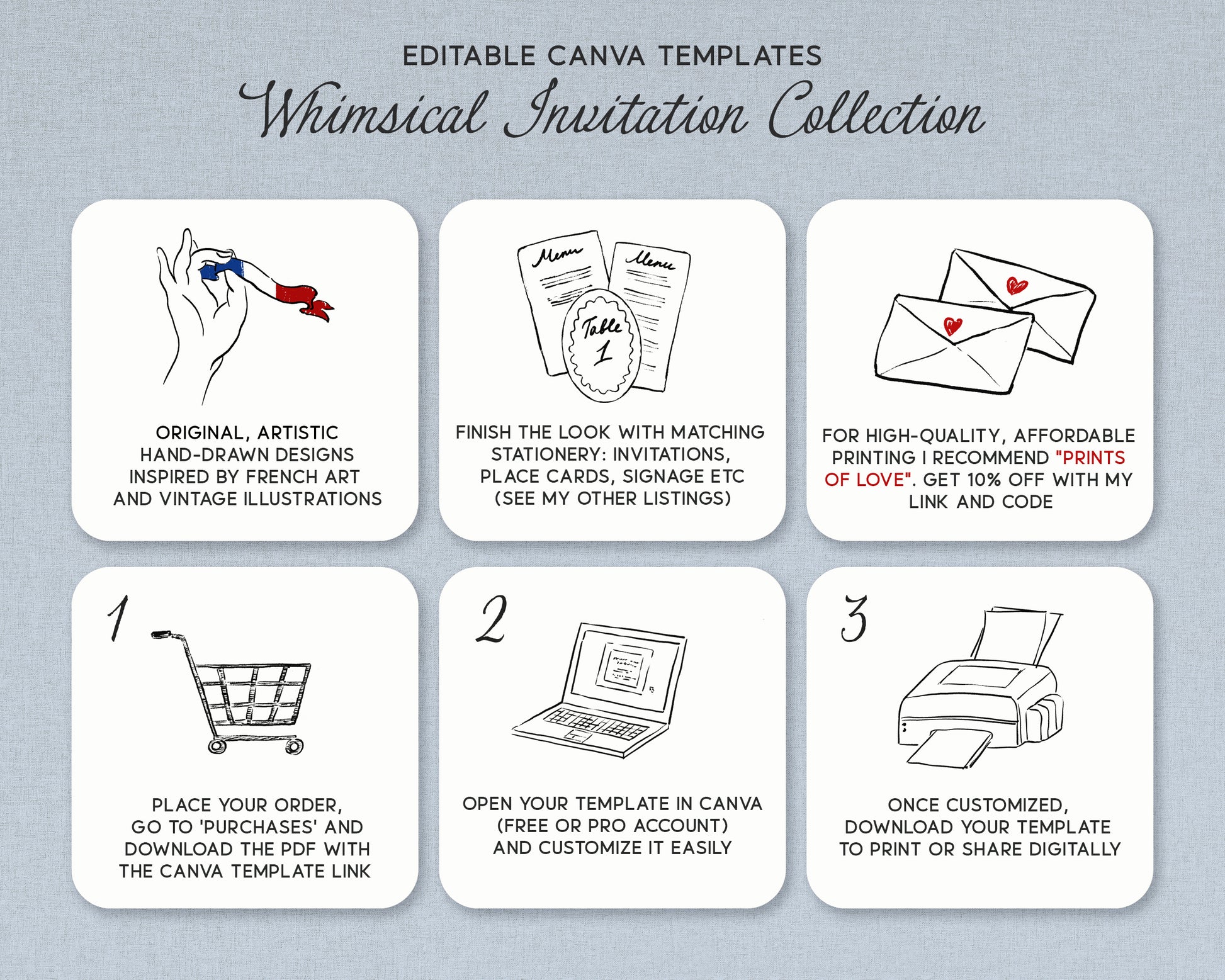 Les polices, le texte, leur disposition et leurs couleurs peuvent être adaptés à vos besoins. Les illustrations et les arrière-plans sont soigneusement conçus et restent en place afin de préserver le style artistique des invitations.