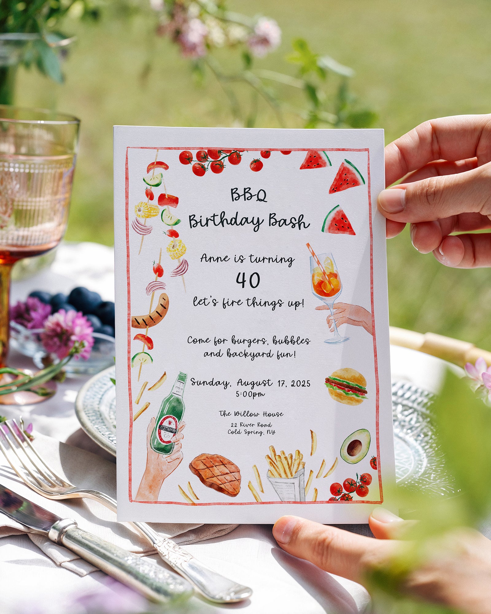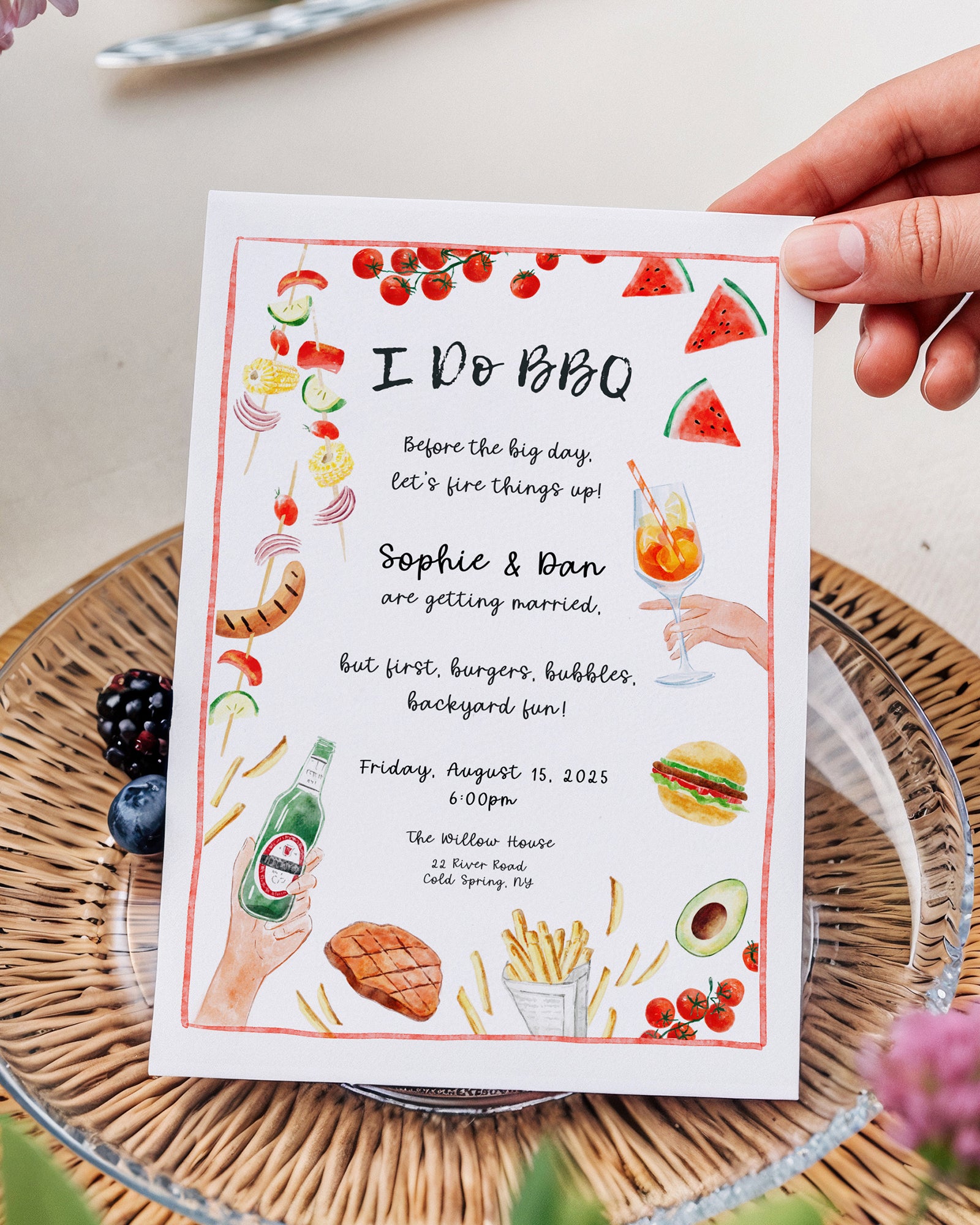 Une version fantaisiste des fêtes estivales. Cette collection d'invitations barbecue allie charme et fantaisie dessinée à la main. Parfaite pour les rassemblements décontractés comme les fêtes « I Do BBQ », les dîners de répétition barbecue, les anniversaires dans le jardin, les fêtes mixtes ou toute autre réunion ensoleillée. Inspirée par l'ambiance nostalgique des pique-niques et la tendance barbecue décontractée.