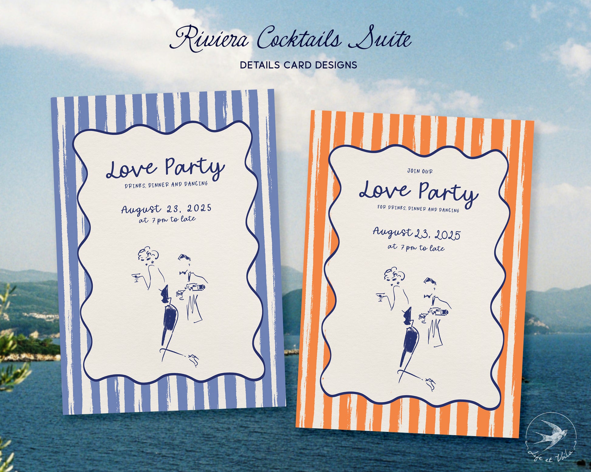 Inspirée par l'élégance insouciante de la Côte d'Azur, cette suite dessinée à la main rassemble des illustrations fantaisistes, des bordures ondulées et une touche rétro fraîche, parfaite pour les couples à la recherche de quelque chose d'amusant, d'élégant et d'unique en son genre.