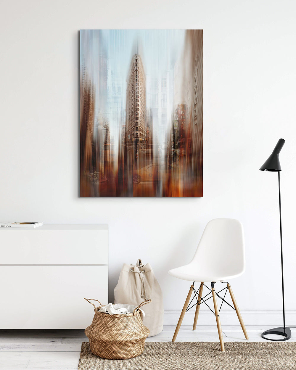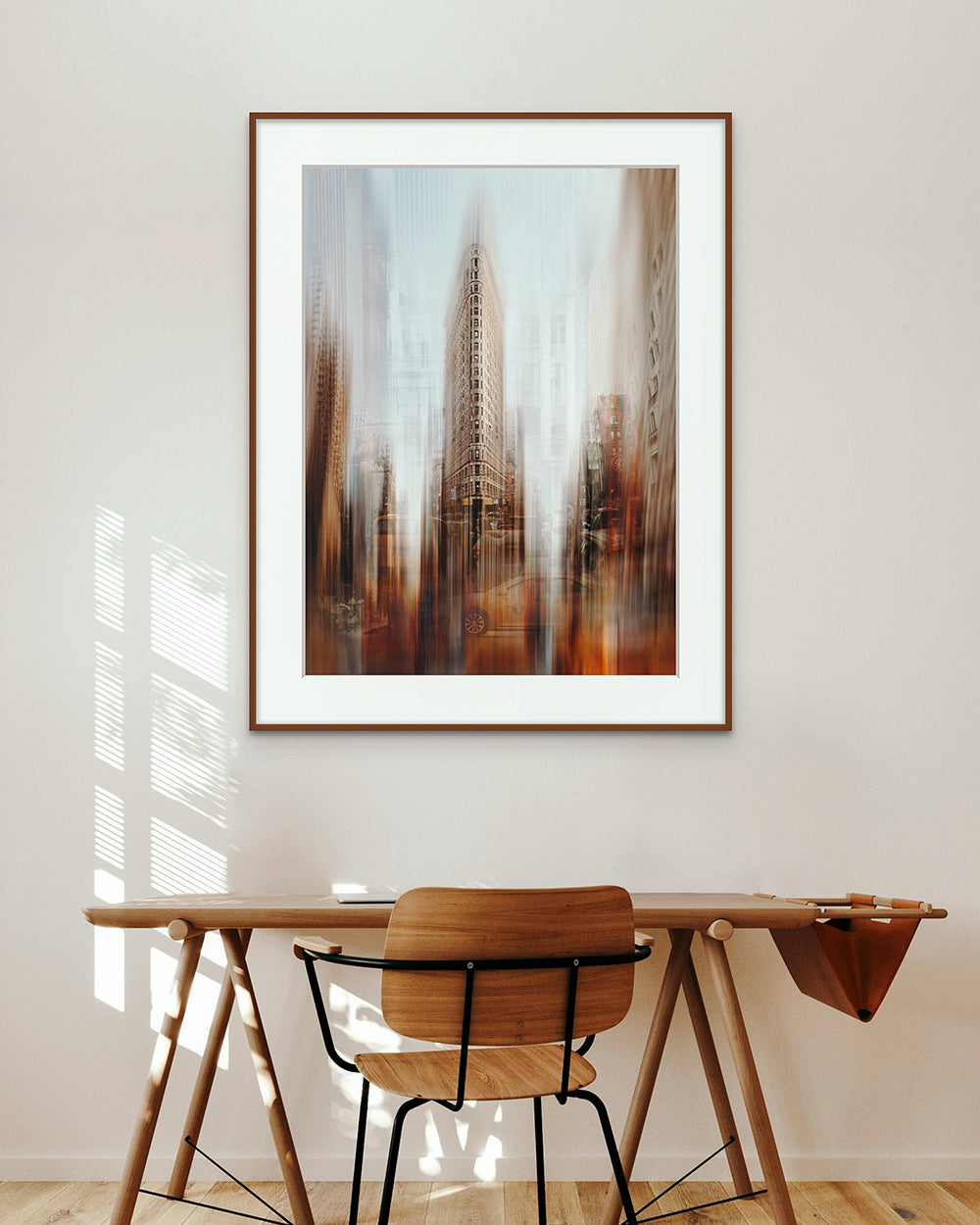 This striking photo artwork from In Between Worlds reimagines the Flatiron Building with a bold, avant-garde perspective. Blurring the boundaries of architecture, it merges motion, light, and texture to capture Manhattan’s vibrant energy.