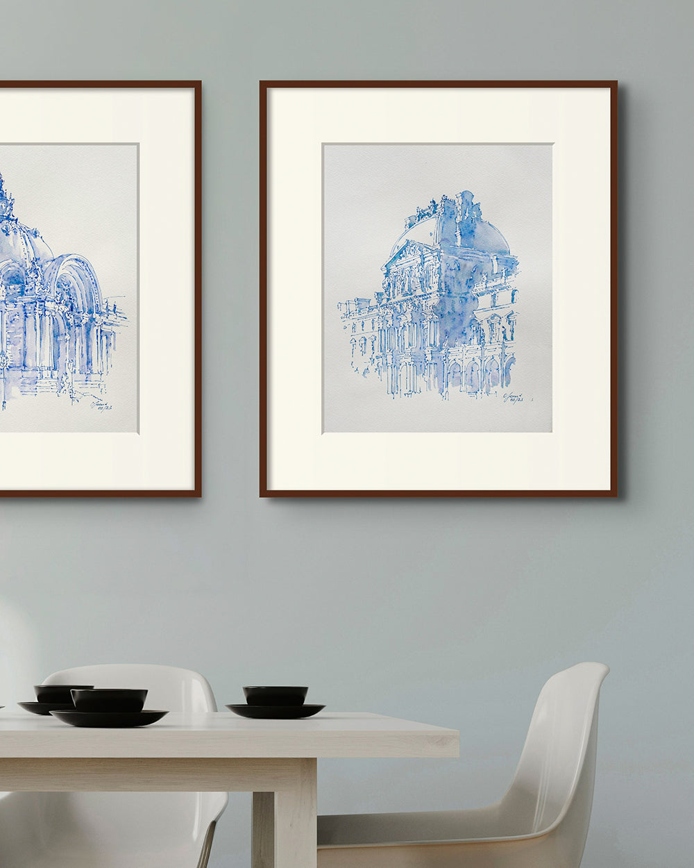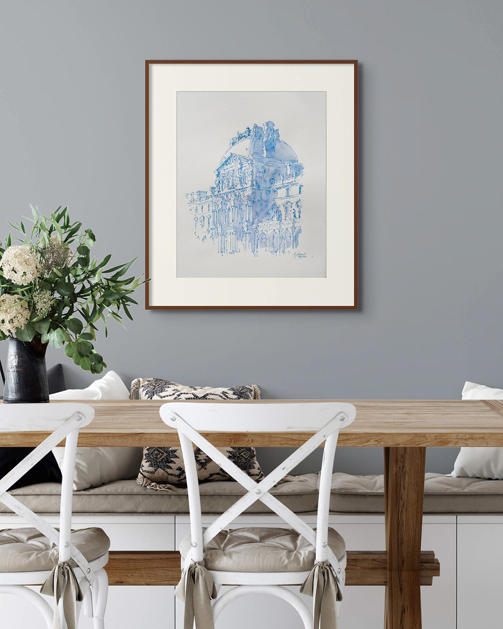 Louvre Blue Watercolor and Ink Original Sketch