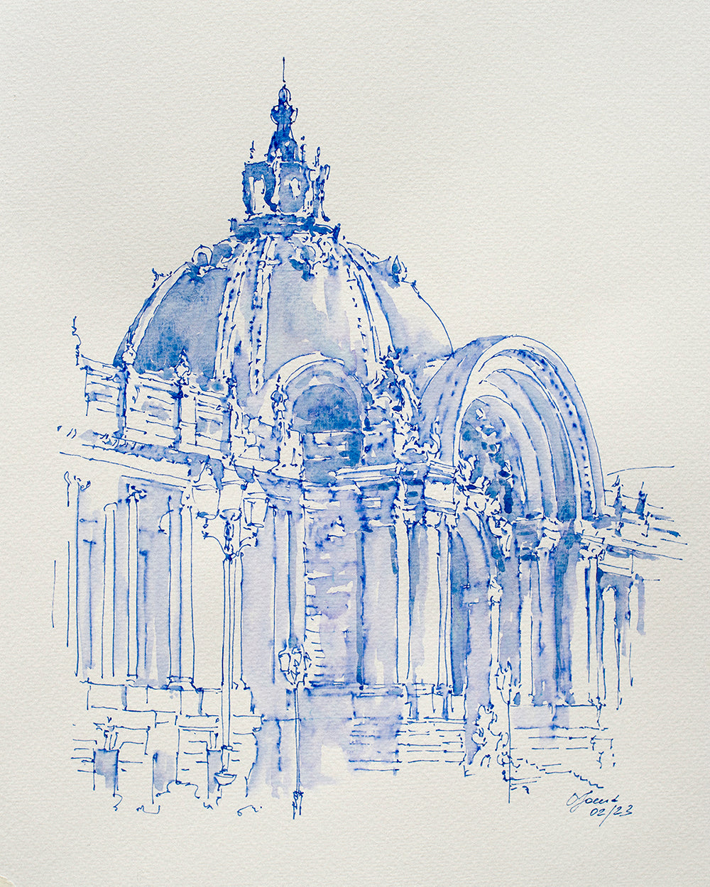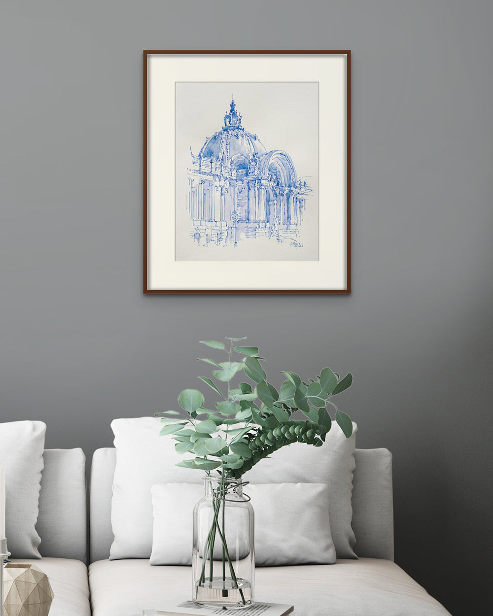 Petit Palais Blue Watercolor and Ink Original Sketch