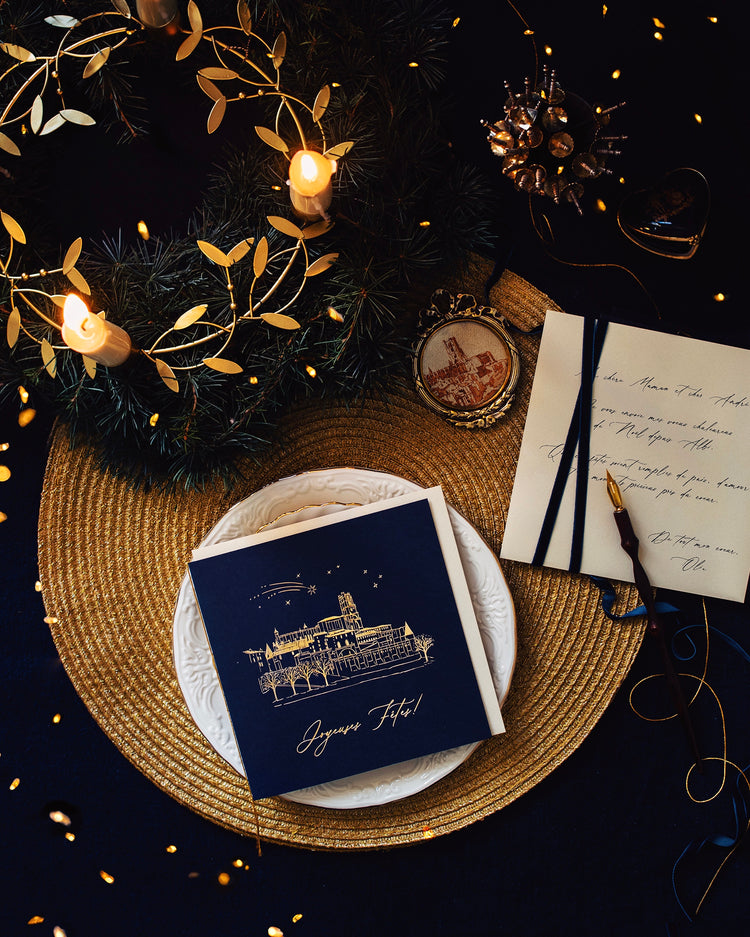 This Christmas card is created as a special homage to Albi. The illustration of the Sainte Cécile Cathedral is printed in gold foil on deep blue paper, giving it a luxurious shiny finish that feels festive and refined.